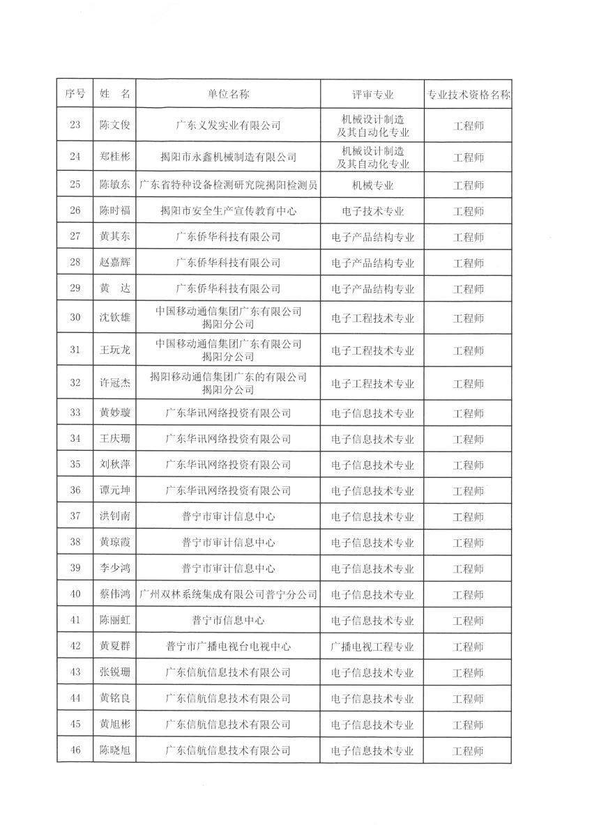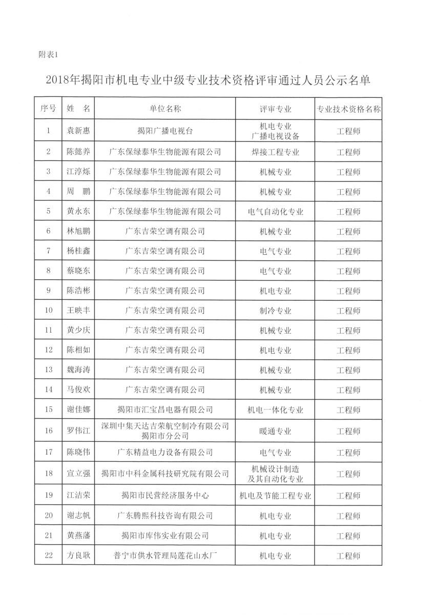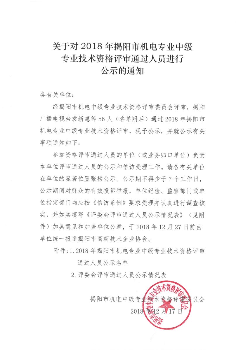 關(guān)于對(duì)2018年揭陽市機(jī)電專業(yè)中級(jí)專業(yè)技術(shù)資格評(píng)審?fù)ㄟ^人員進(jìn)行公示的通知