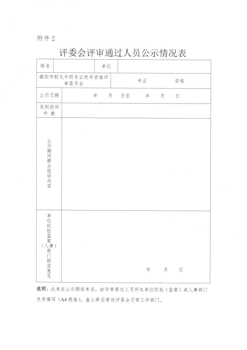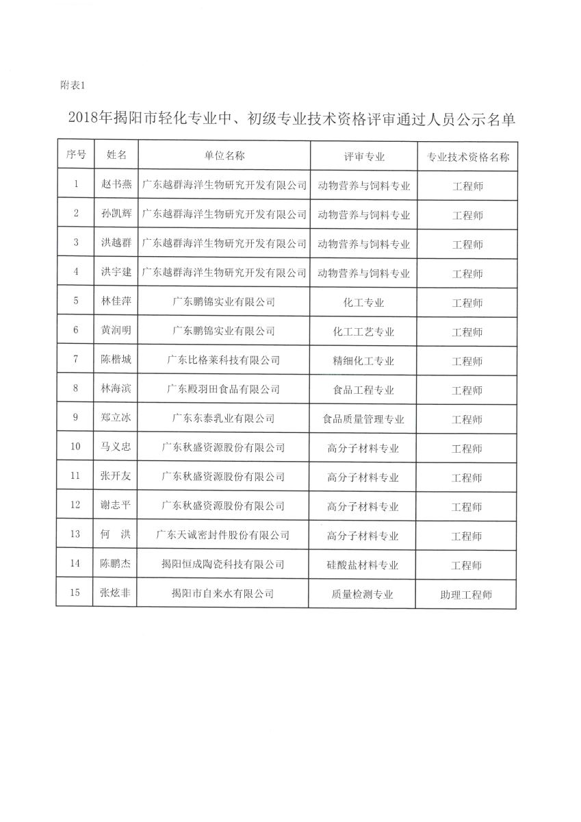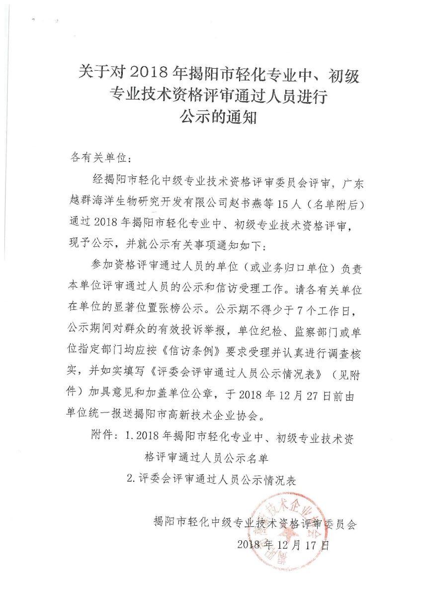 關(guān)于對2018年揭陽市輕化專業(yè)中、初級專業(yè)技術(shù)資格評審?fù)ㄟ^人員進行公示的通知