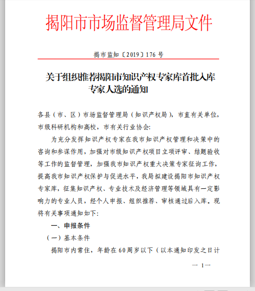 現(xiàn)轉發(fā)《揭陽市市場監(jiān)督管理局關于組織推薦揭陽市知識產(chǎn)權專家?guī)焓着霂鞂<胰诉x的通知》(揭市監(jiān)知【2019】176號),請有意向申報的人員按文件內容填寫申請表,并于2019年8月11日前發(fā)送高企協(xié)會匯總。