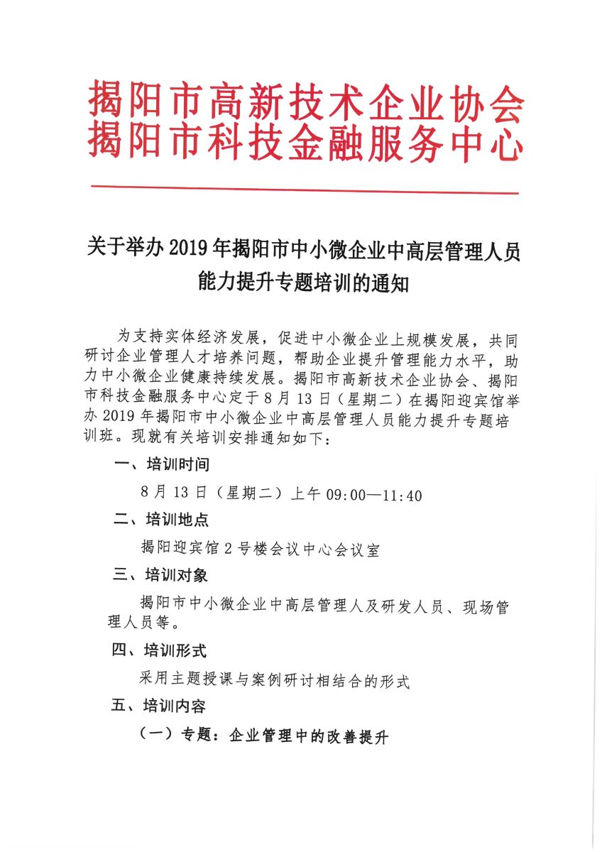 關(guān)于舉辦2019年揭陽市中小微企業(yè)中高層管理人員能力提升專題培訓(xùn)的通知