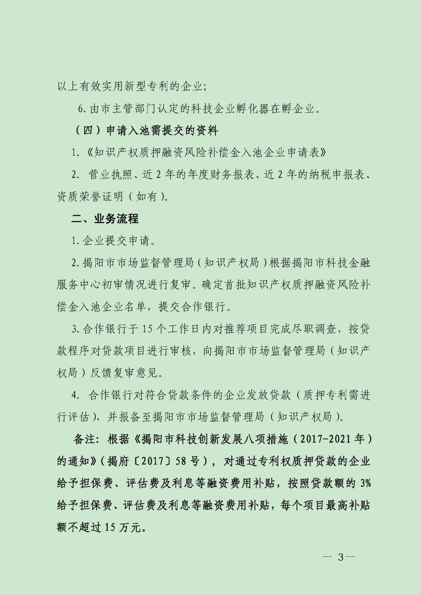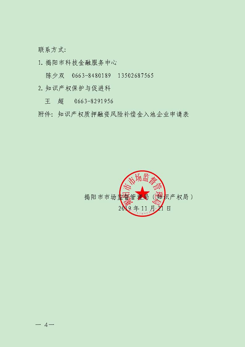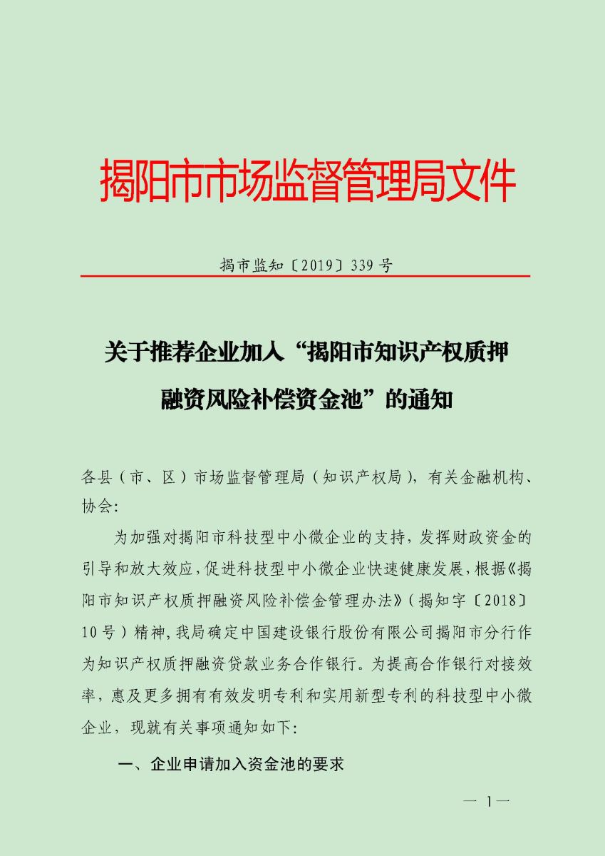 關(guān)于推薦企業(yè)加入"揭陽(yáng)市知識(shí)產(chǎn)權(quán)質(zhì)押融資風(fēng)險(xiǎn)補(bǔ)償金入池”的通知