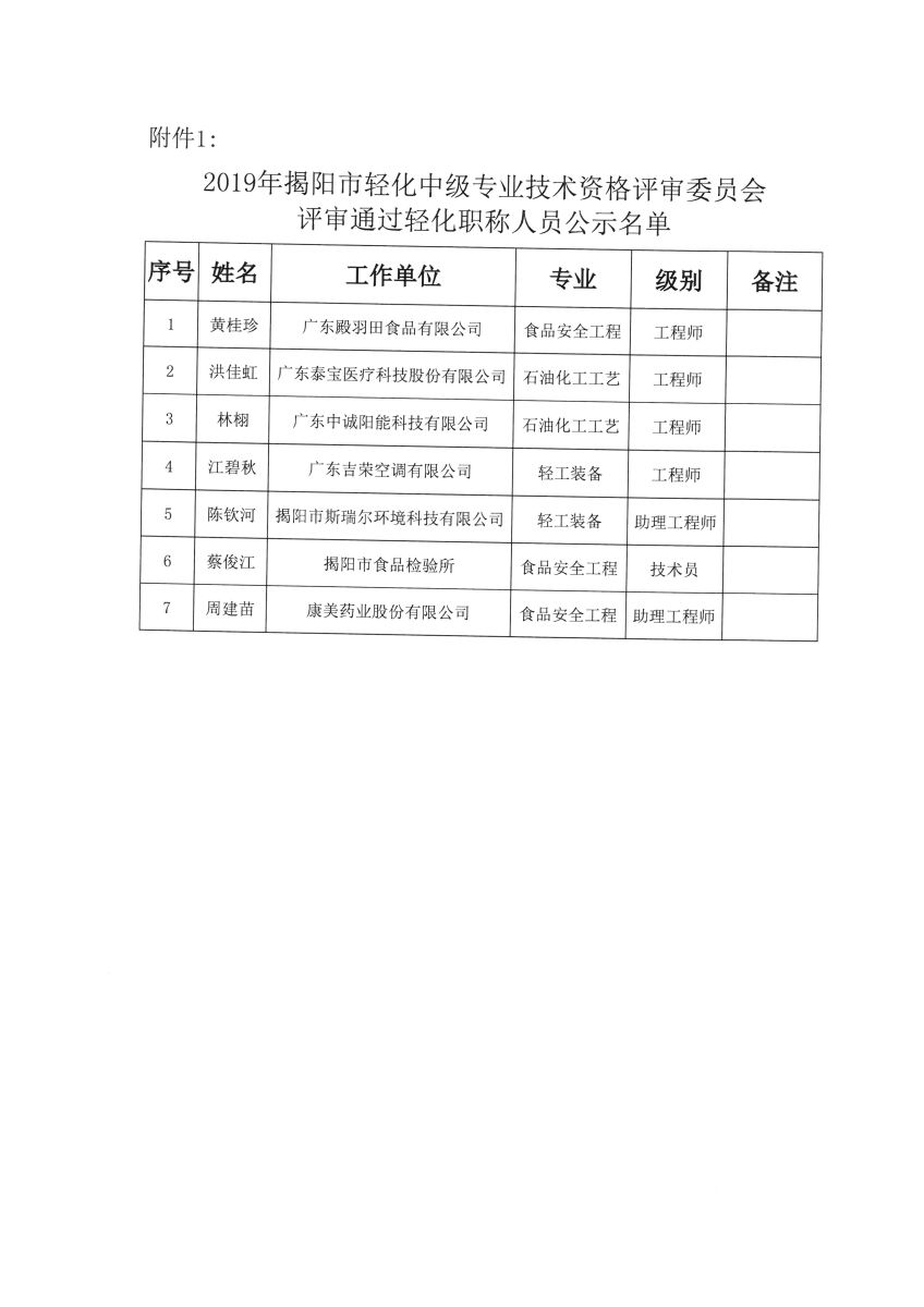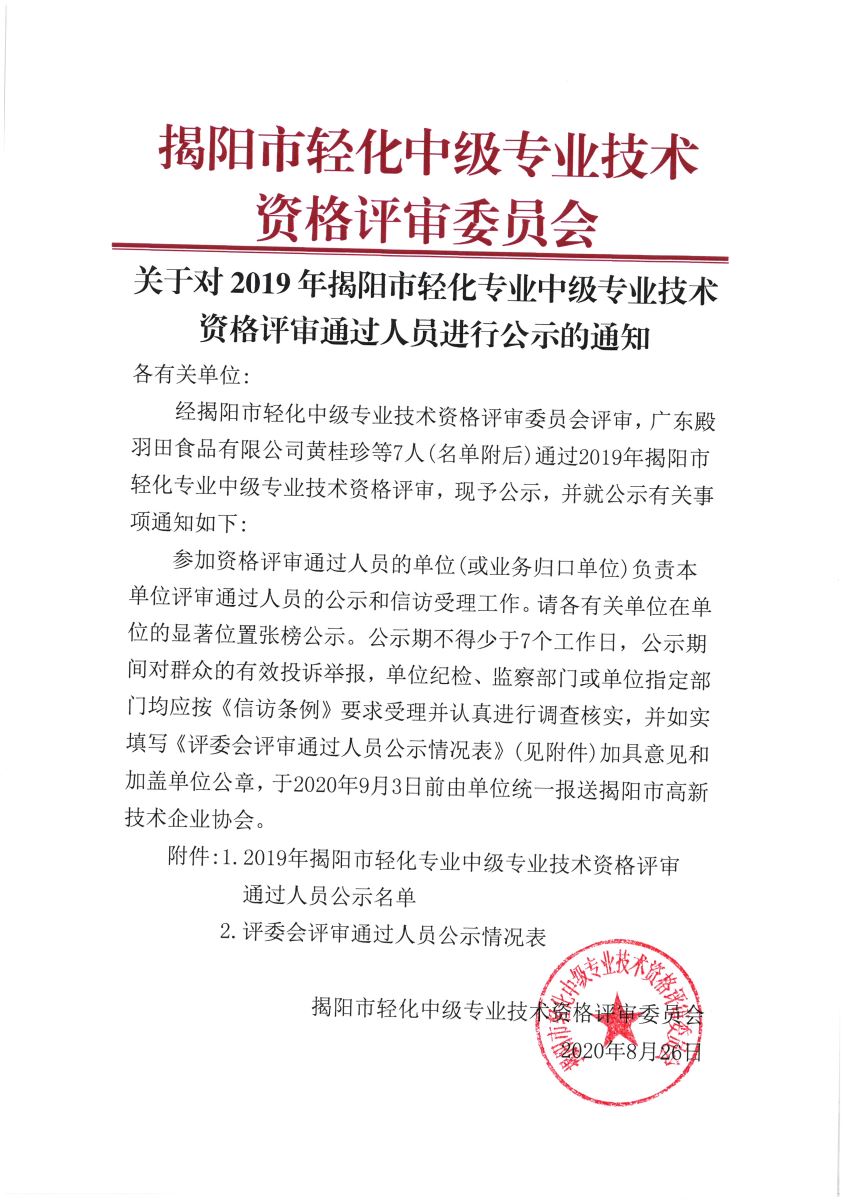 關于對2019年揭陽市輕化專業(yè)中級專業(yè)技術資格評審通過人員進行公示的通知