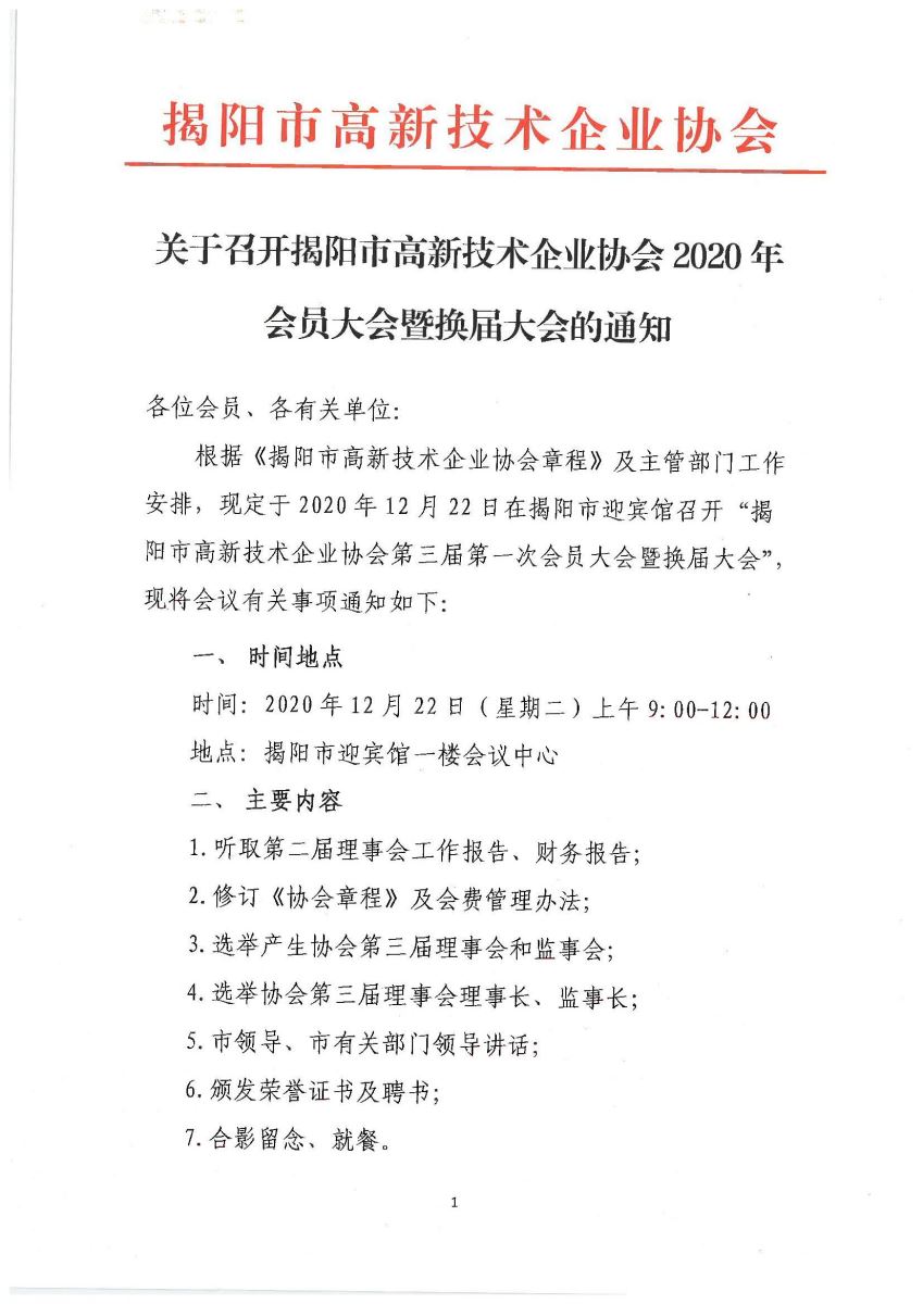 關(guān)于召開揭陽市高新技術(shù)企業(yè)協(xié)會2020年會員大會暨換屆大會的通知