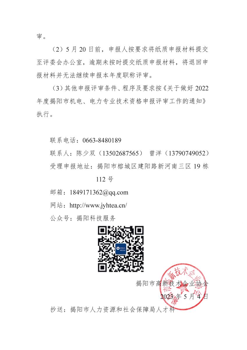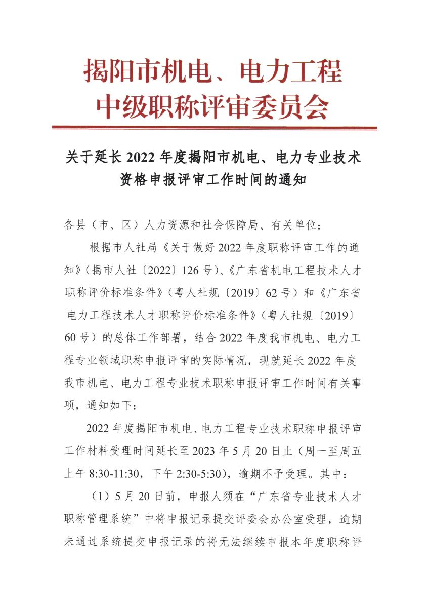 關(guān)于延長(zhǎng)2022年度揭陽(yáng)市機(jī)電、電力專(zhuān)業(yè)技術(shù)資格申報(bào)評(píng)審工作時(shí)間的通知