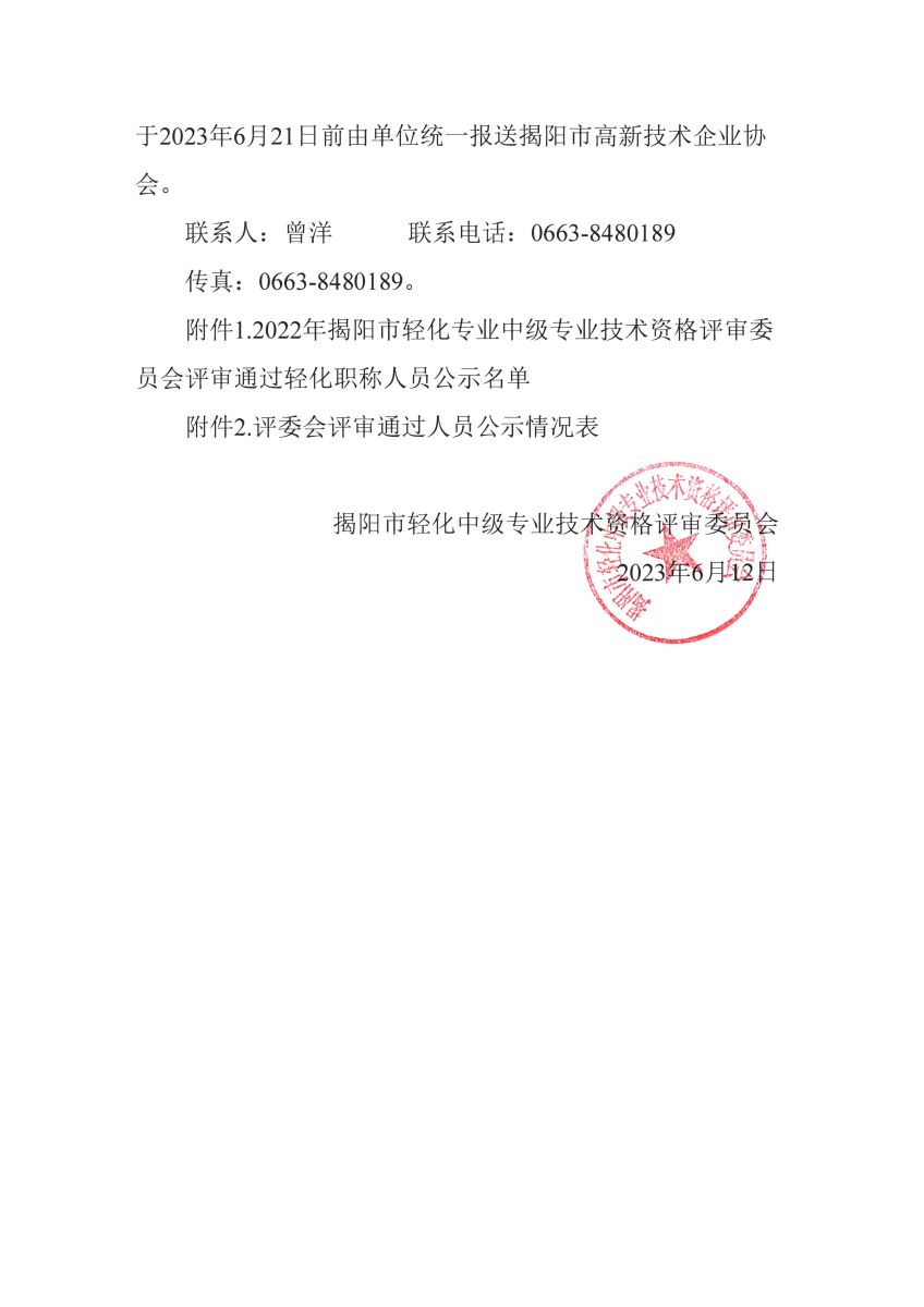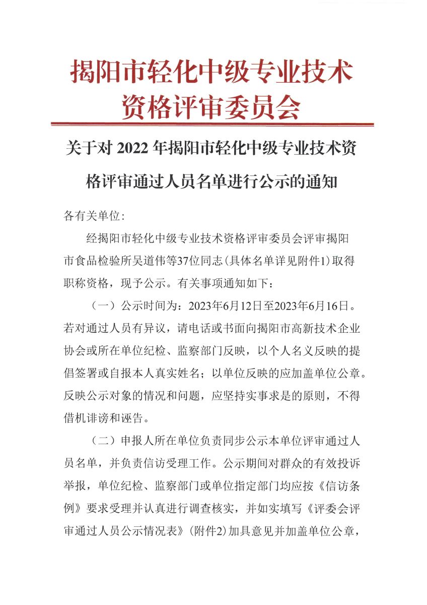 關(guān)于對2022年揭陽市輕化中級專業(yè)技術(shù)資格評審?fù)ㄟ^人員名單進行公示的通知