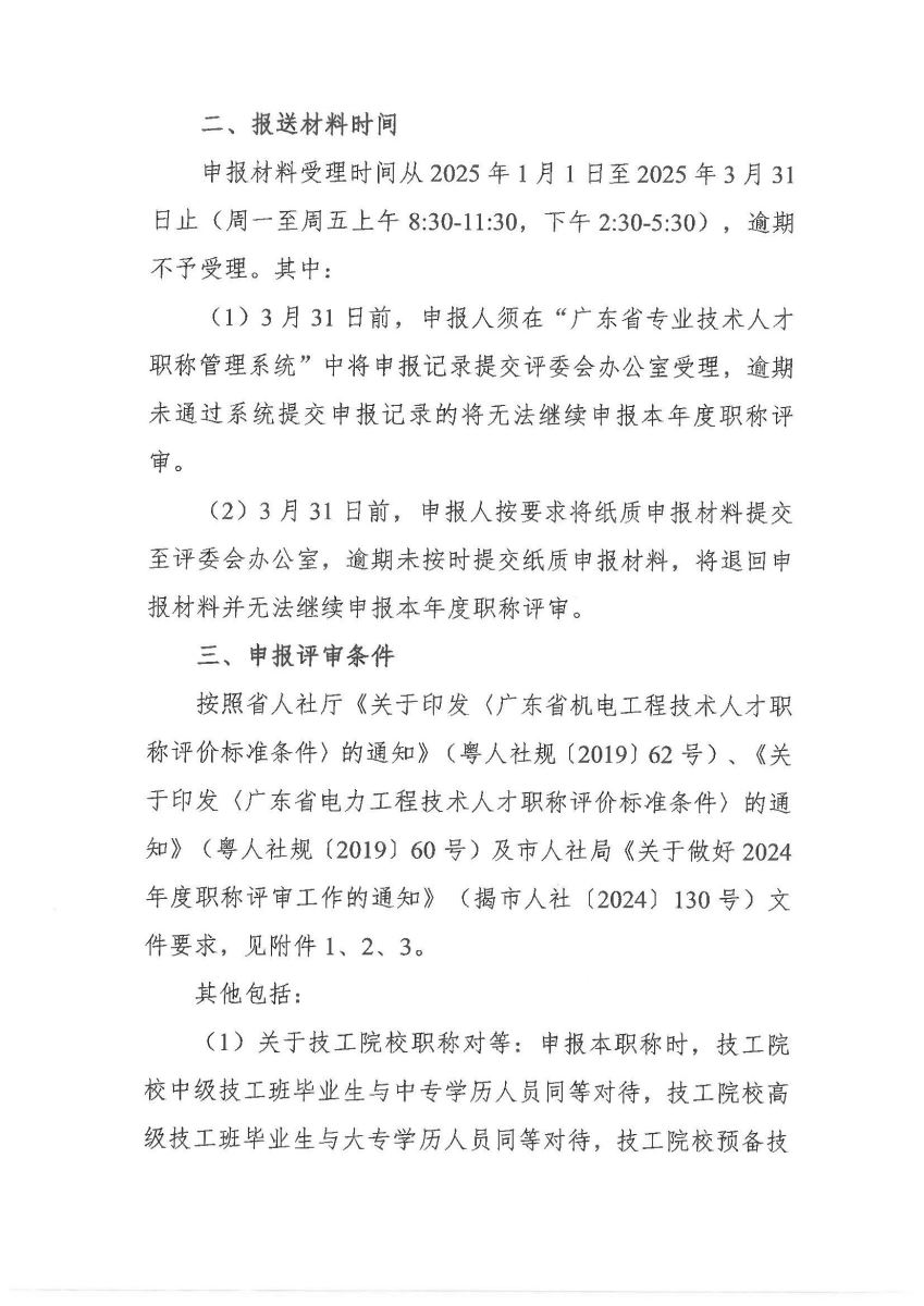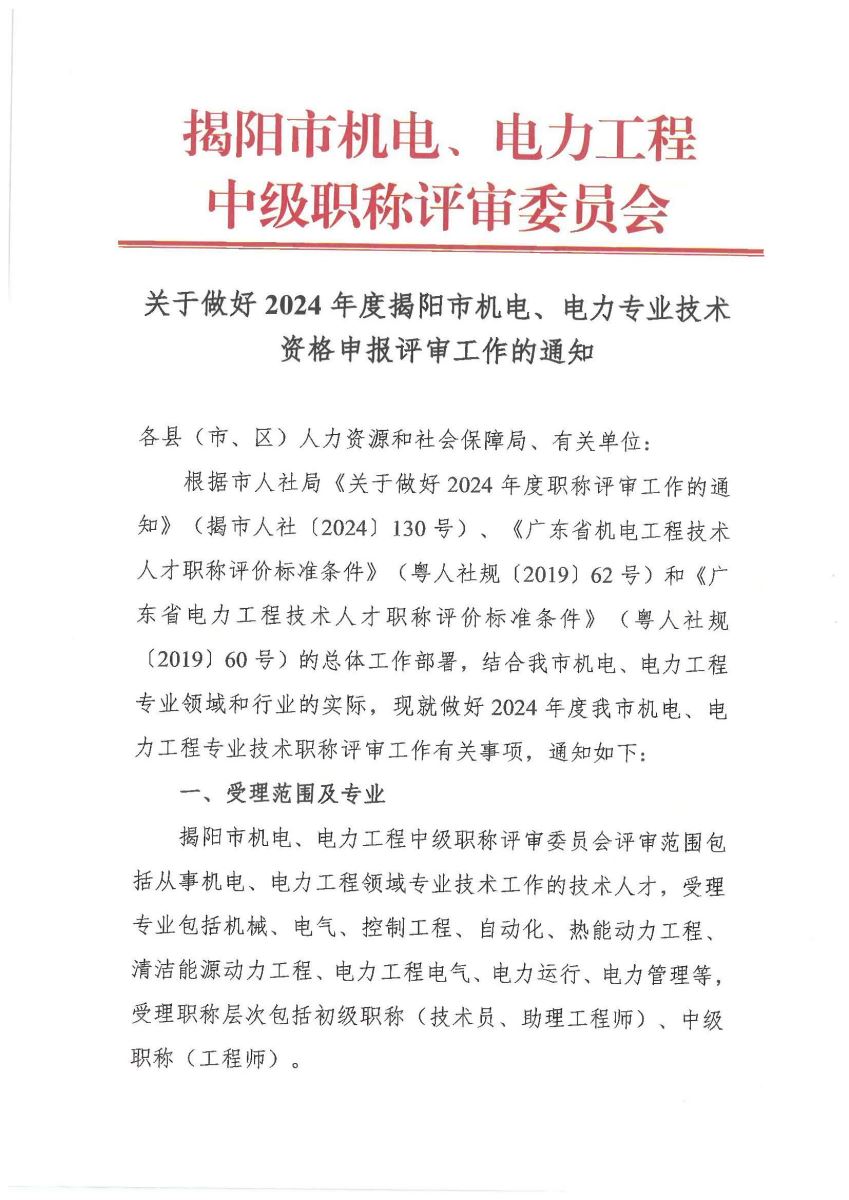 關(guān)于做好 2024 年度揭陽市機電、電力專業(yè)技術(shù)資格申報評審工作的通知